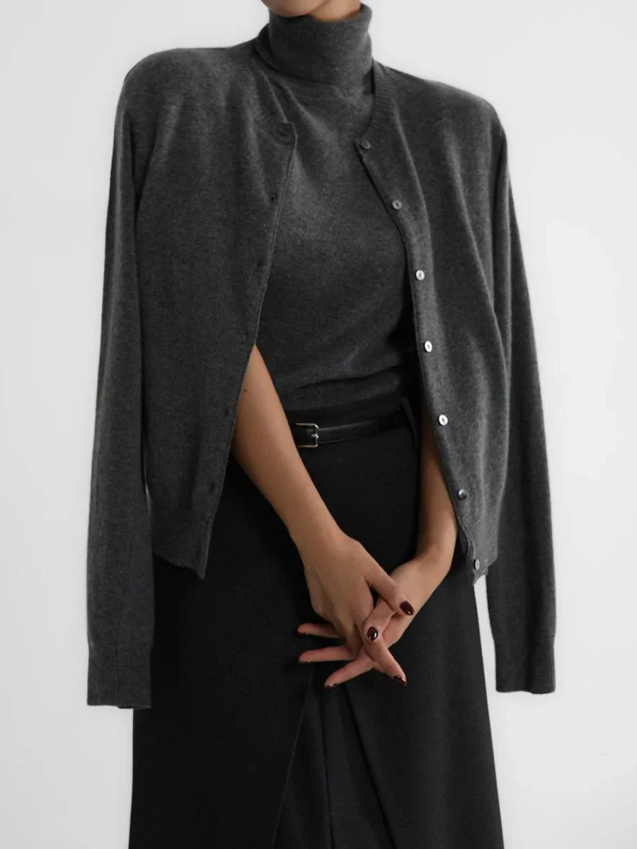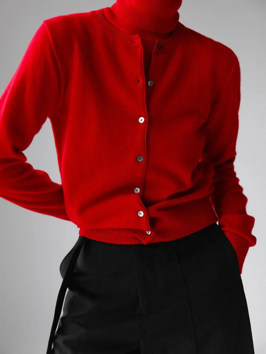 This sleeveless knitted vest features a high rolled neckline and clean shoulder seams for a structured outline. The design is finished with a ribbed hem that sits neatly at the waist. Its fitted silhouette and smooth surface create a streamlined shape suitable for layering or standalone wear.